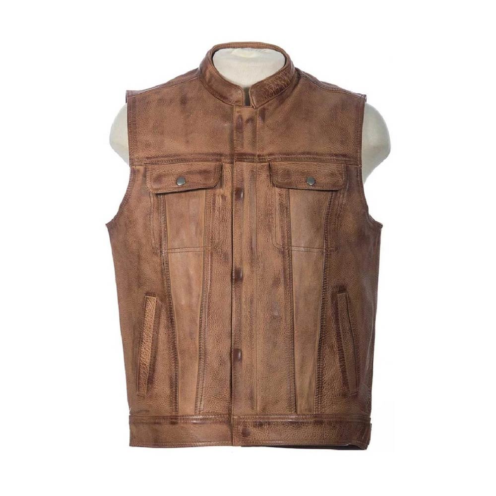 This vest has armor pockets in shoulders and back. Add inserts for more safety on rides. Strong leather covers the front and sides. It protects against wind and small hits. Breathable lining stops too much sweat. Vents help air flow on hot days. Perfect for city rides or long trips. Stay safe without full jacket.